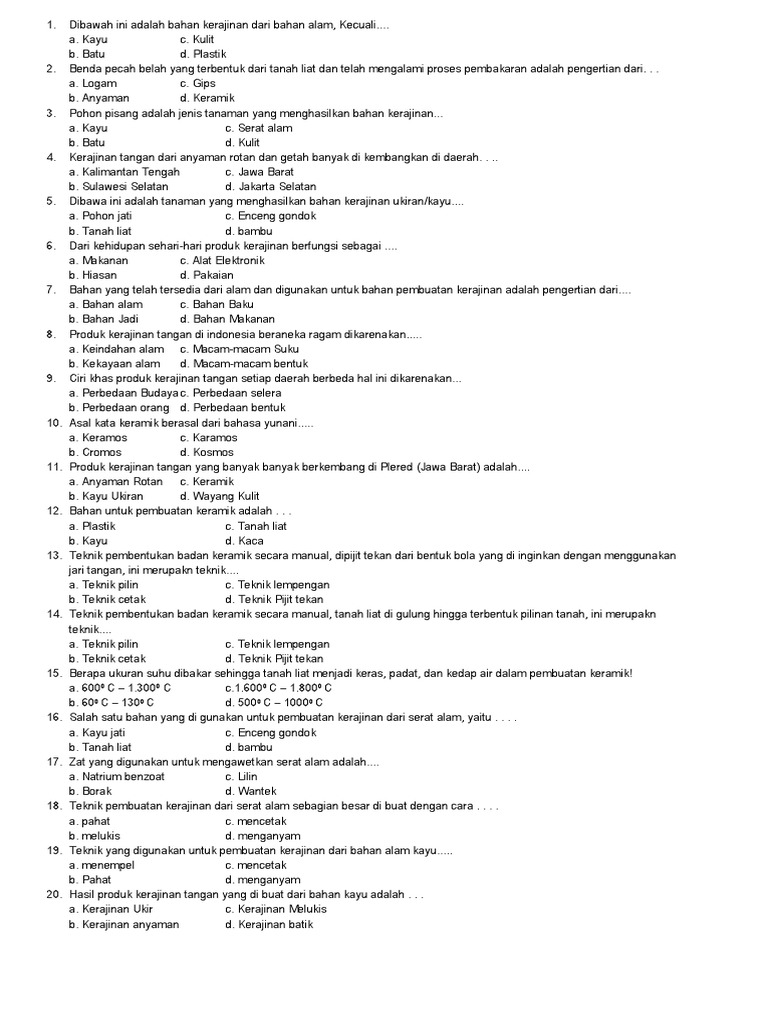 Contoh Soal Seni Budaya Kelas 10 Semester 2 Beserta ... from id-static.z-dn.net Adik adik, pada kesempatan yang baik ini kakak ingin berbagi 40 contoh soal pilihan ganda untuk mata pelajaran prakarya kelas 11 sma/ma beserta dengan kunci jawabannya. Baiklah kami ingin memberikan contoh penerapan soal c1 c2 c3 c4 c5 dan c6 yang terdiri dari 3 ranah yaitu ranah kognitif afektif dan psikomotorik pada kurikulum 2013 revisi 2017 agar nantinya bapak dan ibu dalam membuat soal bisa menghasilkan soal bermutu dan tentunya berdasarkan dengan taksonomi bloom revisi terbaru. Prakarya didefinisikan sebagai hasil kerja yang belum jadi atau masih dalam bahan.